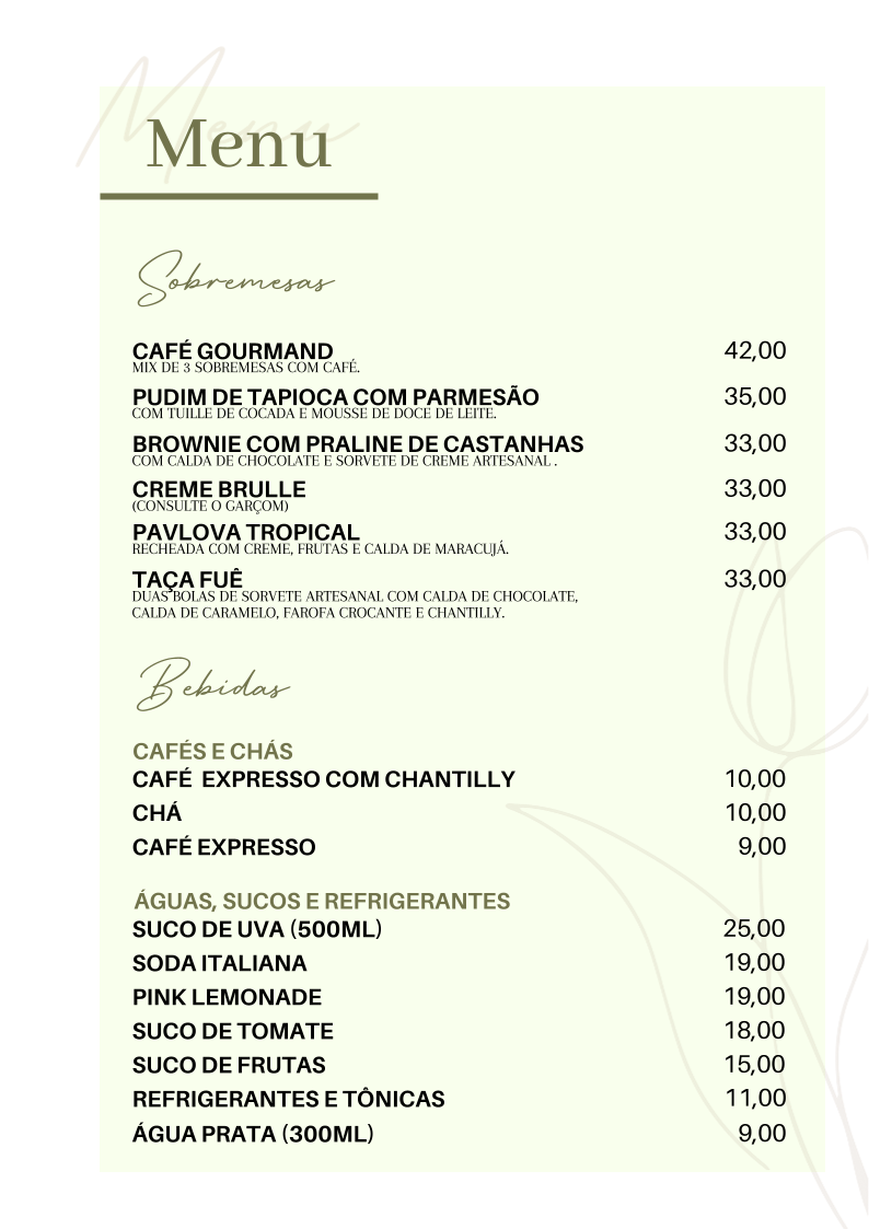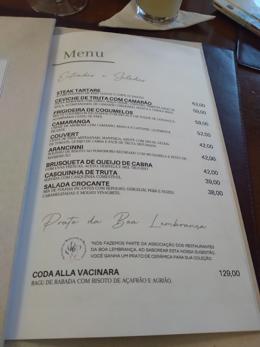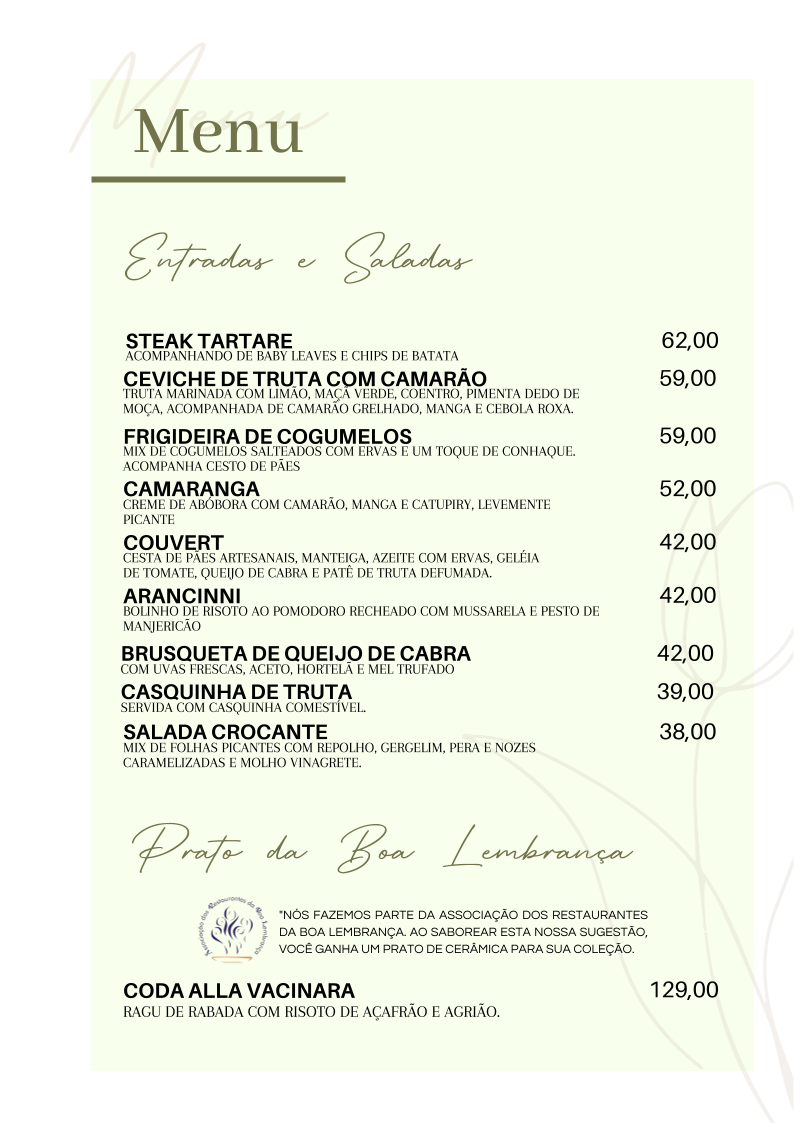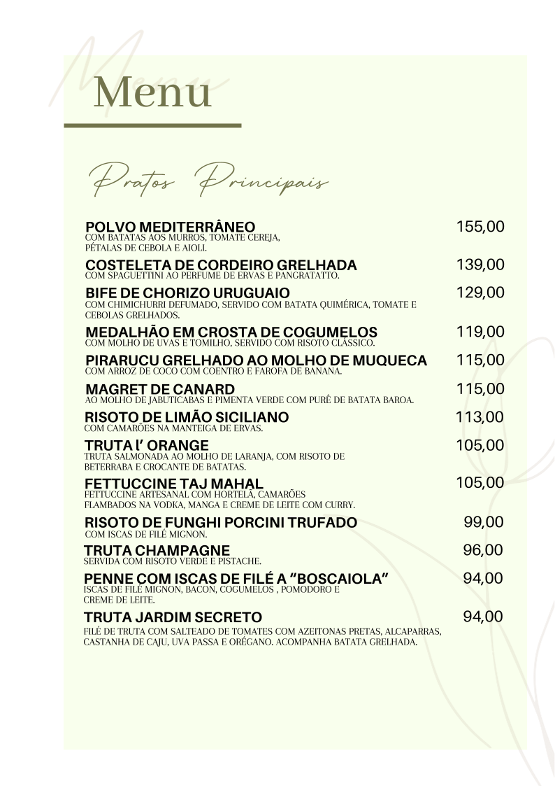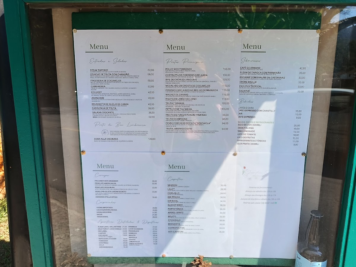 Restaurante Jardim Secreto - Penedo RJ offers a culinary experience deeply rooted in nature’s tranquility and refined flavors. The menu highlights the Coda alla Vacinara, a tender oxtail ragu paired with saffron risotto and watercress, a signature dish that perfectly balances rustic heartiness and elegance for R$129.00. The dessert selection is equally impressive, featuring a diverse range from creamy Pudim de Tapioca com Parmesão to the tropical freshness of Pavlova recheada com creme e frutas, all crafted with meticulous attention to detail.